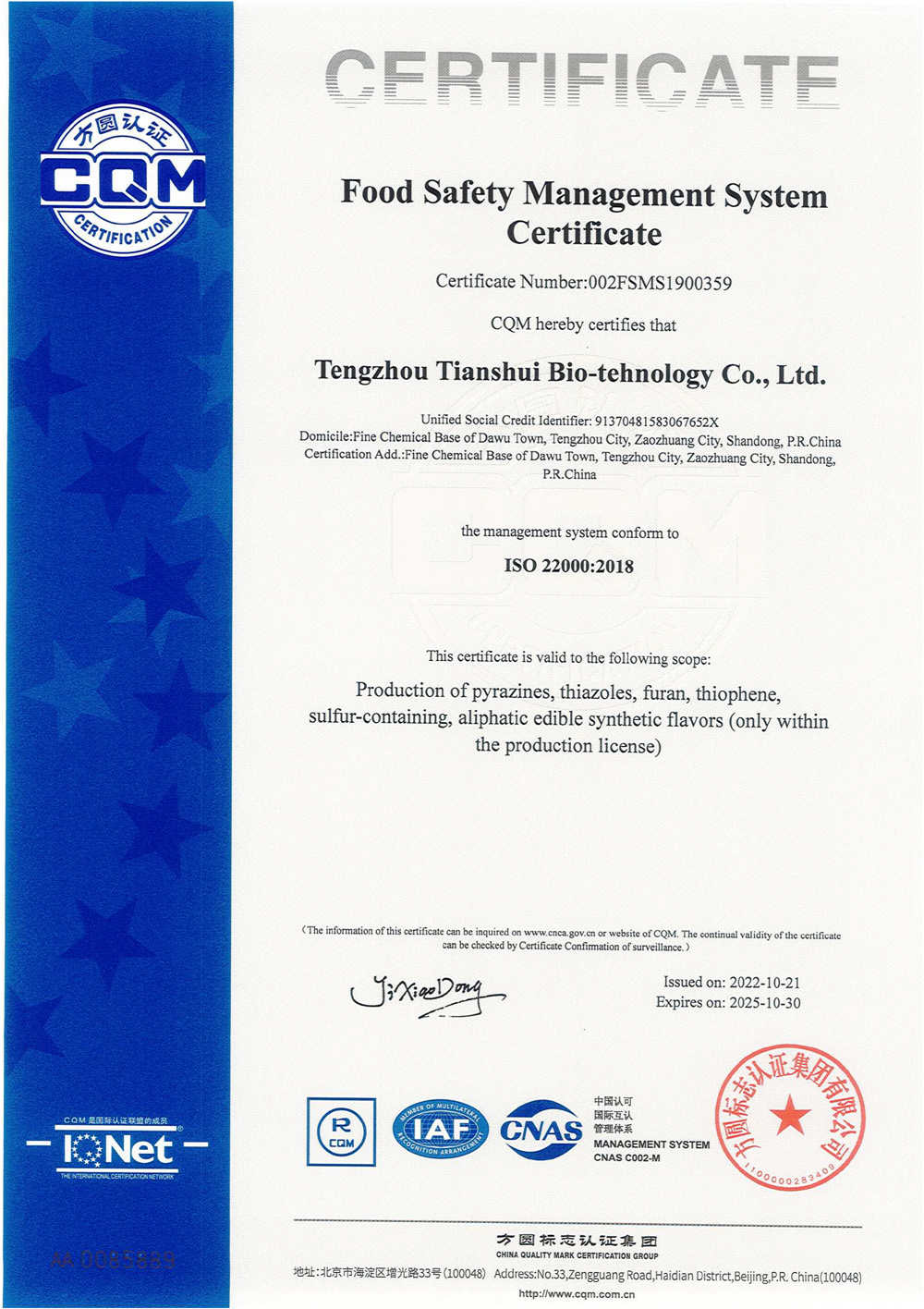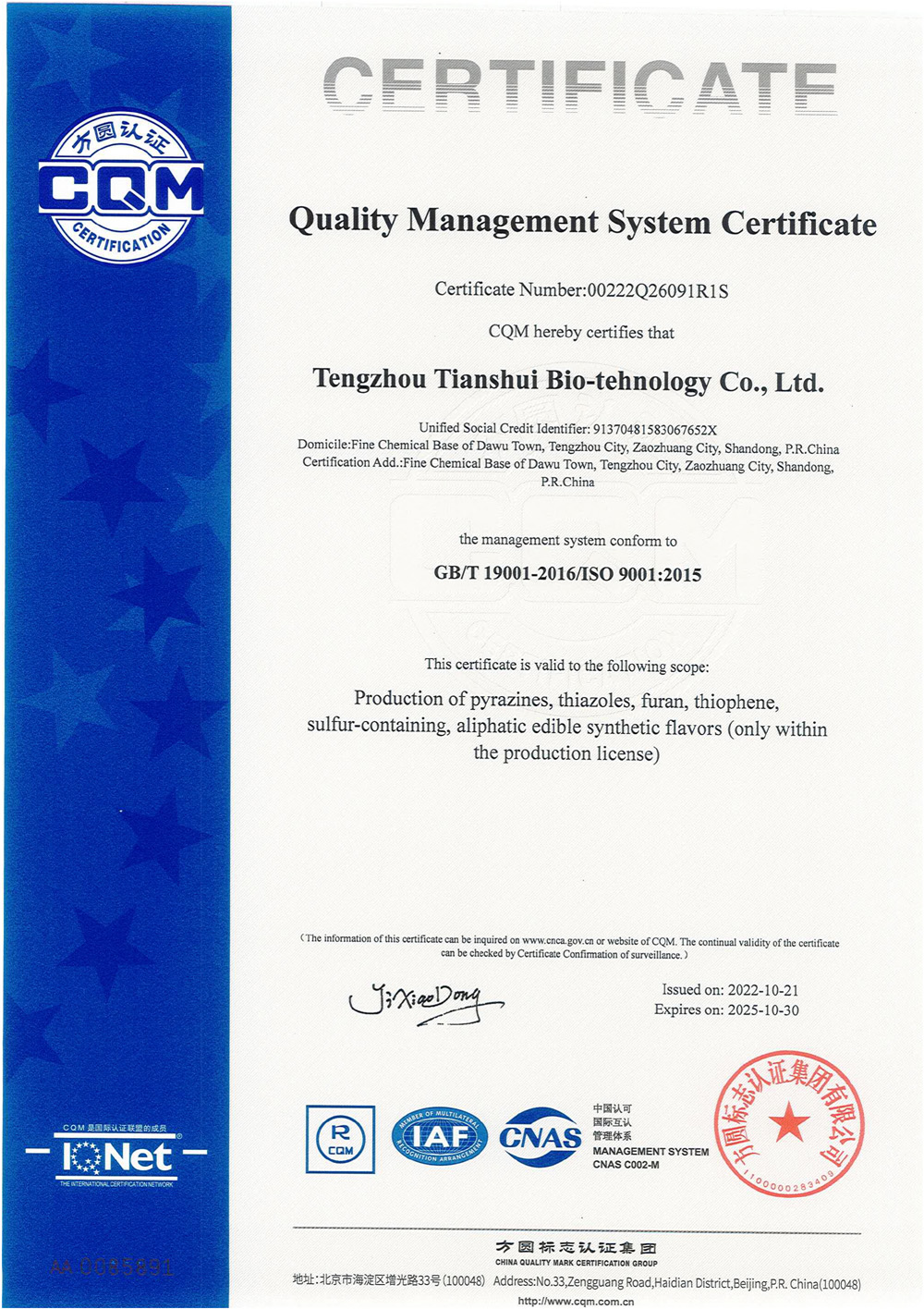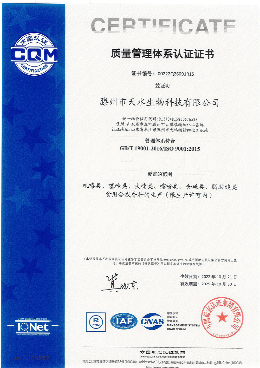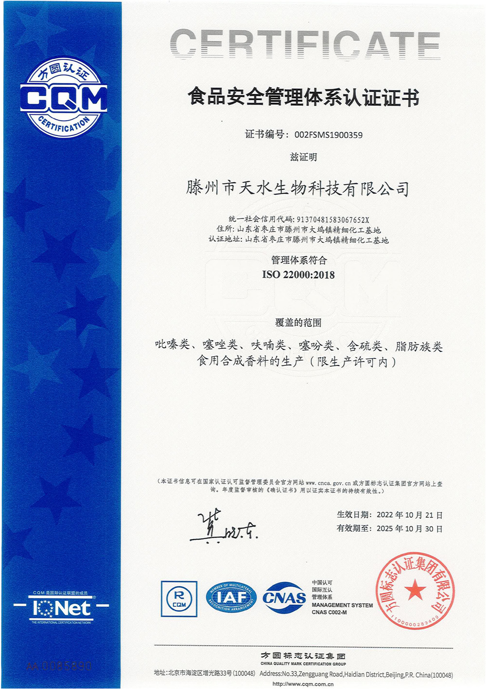 滕州市天水生物科技有限公司成立于2011年9月,是目前國(guó)內(nèi)雜環(huán)類合成食品香料、日化香料和醫(yī)藥中間體生產(chǎn)經(jīng)營(yíng)的綜合性企業(yè)。坐落于山東省滕州市生物醫(yī)藥產(chǎn)業(yè)基地,總投資5000余萬元,占地面積約30000平方米,員工百余人。公司先后被評(píng)為高新技術(shù)企業(yè)、專精特新中小企業(yè)、科技型中小企業(yè),建有市級(jí)重點(diǎn)實(shí)驗(yàn)室1處,并先后獲得ISO9001質(zhì)量體系認(rèn)證、ISO22000食品安全體系認(rèn)證、kosher認(rèn)證和Halal認(rèn)證。是香精香料及食品配料協(xié)會(huì)會(huì)員單位及滕州市中小企業(yè)協(xié)會(huì)理事單位。
